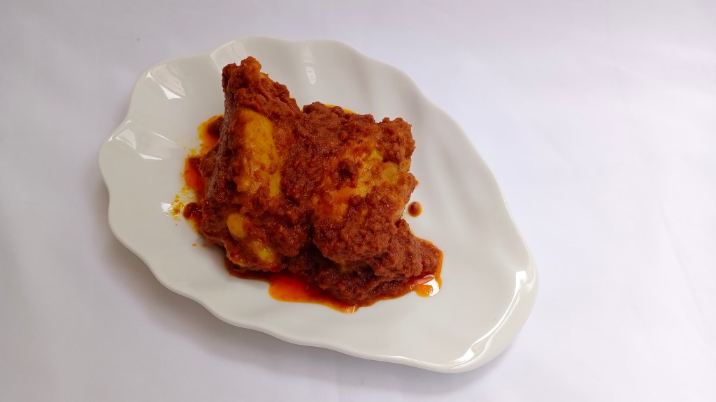 - Masukkan daging ayam, tambahkan santan, masak hingga matang dan mengental. Jangan lupa tambahkan garam.